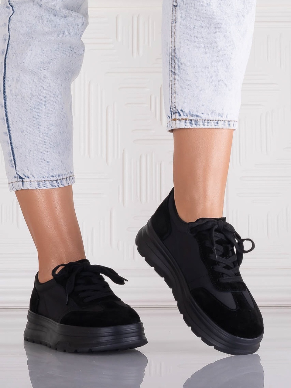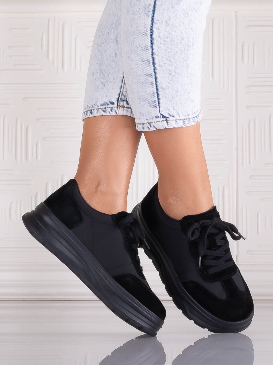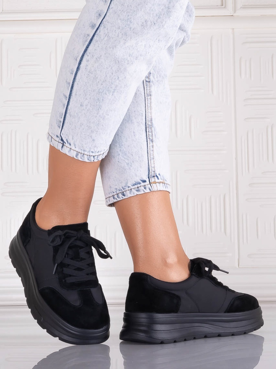 Pantofi damă casual negri din piele naturală întoarsă și textil Narella – confort și stil modern